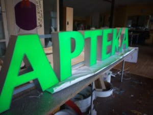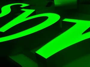 Z daleka widoczne, litery przestrzenne z zielonymi modułami led.